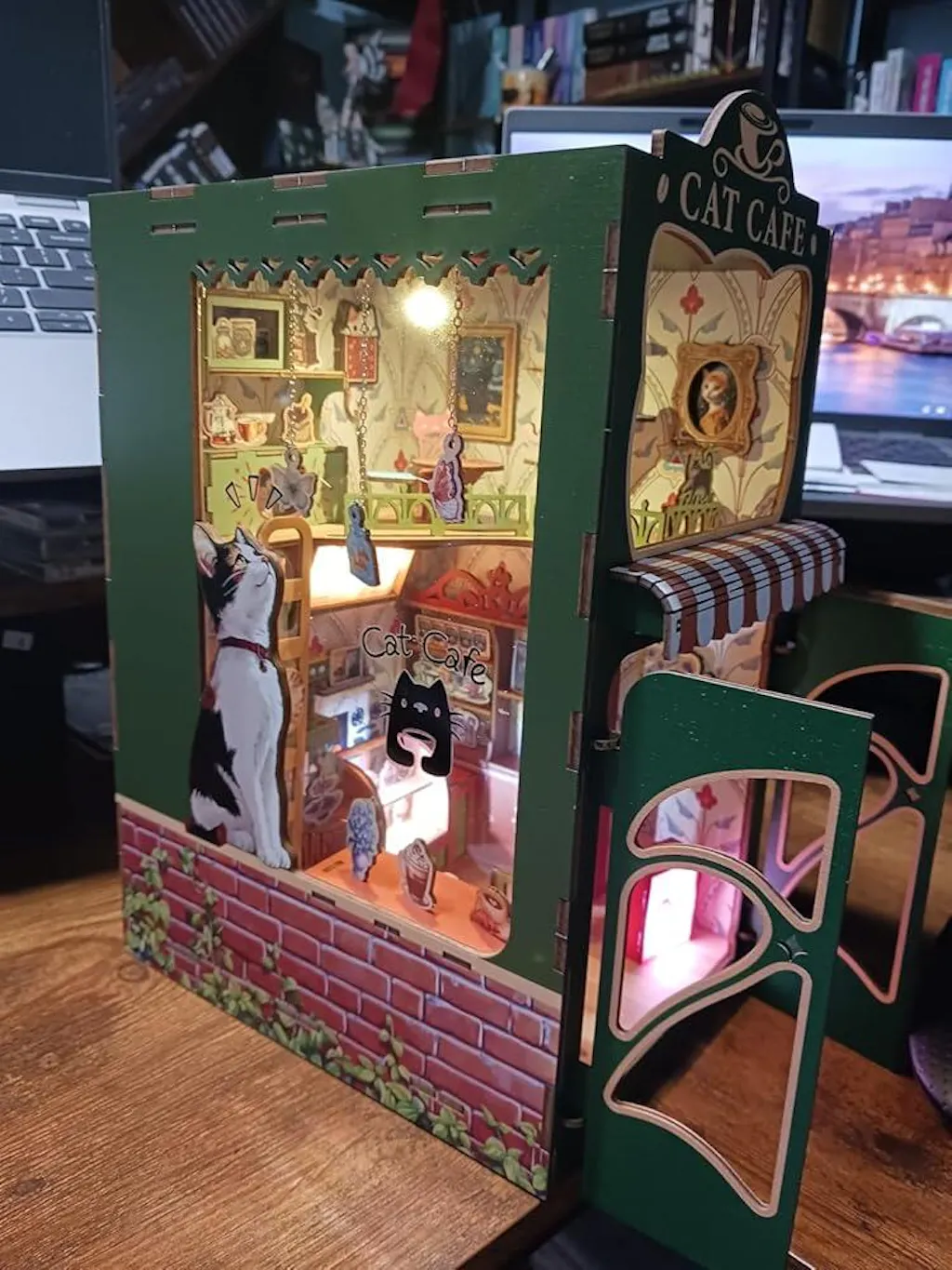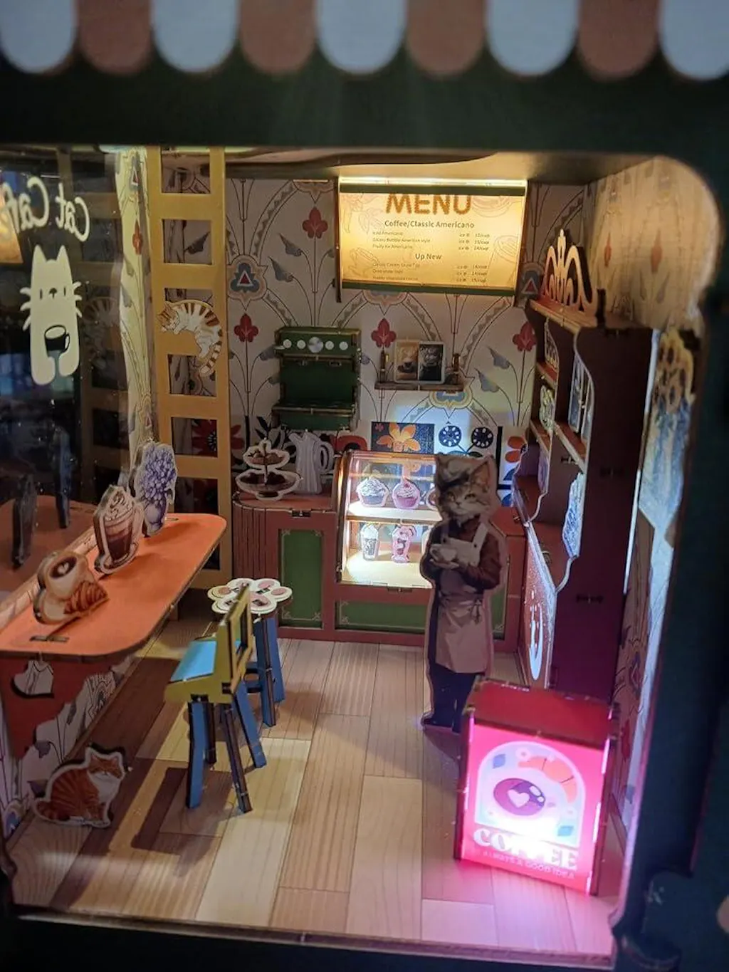 It contains a variety of mini models such as cats in various forms, a window bar, a coffee machine, and a dessert cabinet. The window pendants are flexible and can be freely matched, creating a warm and lovely cafe atmosphere, reminiscent of a pleasant afternoon tea time. The product is equipped with four controllable light sources, the light is soft and warm, and can be used as a night light, or it can be lit up as a decorative ornament to add interest to the space. The assembly process is fun, and the finished product is both practical as a book stand and has ornamental value. It is a creative handmade model that combines artistry and practicality.