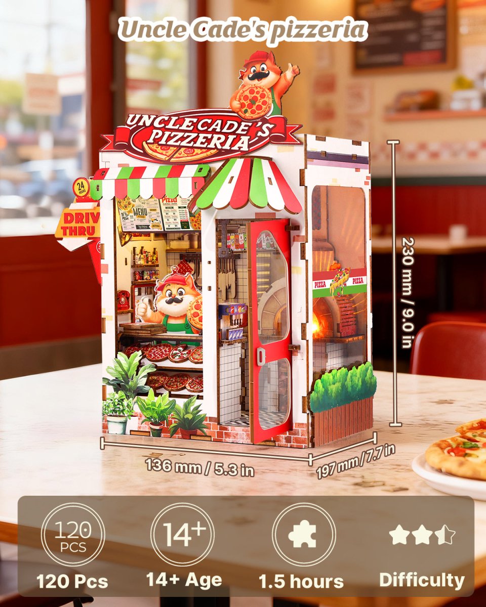 Welcome to Uncle Cade’s Pizzeria, a cozy miniature world brimming with warmth and the irresistible aroma of pizza. At the heart of this delightful scene is Uncle Cade, a cheerful cat chef who greets every guest with open paws and genuine hospitality. The colorful shop sign and striped awning invite you into a bustling pizza kitchen filled with charm — shelves stacked with various pizzas, a detailed menu, and a glowing pizza oven radiating homely comfort. Every corner captures the joy of good food and friendly service.