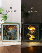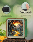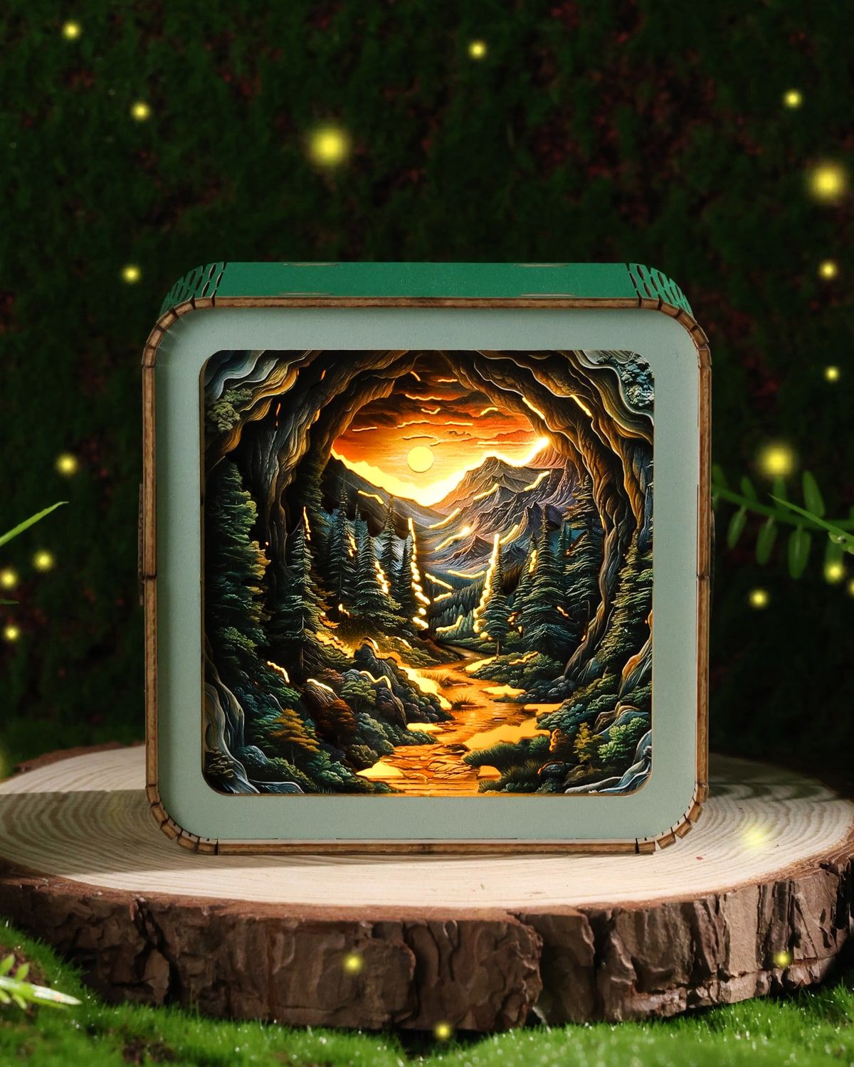 The inspiration comes from the view of the forest and sunrise in the distance from the cave entrance in the early morning. The foreground is a concave rock cave, giving people a sense of enclosure. The plants and animals in the foreground have a strong sense of layering, which makes the vision feel depth and transparency. The soft yellow at sunrise contrasts sharply with the cold-toned mountains in the background, creating a warm and peaceful atmosphere. The tangled trees and lush plants enrich the picture, and the winding path adds a sense of vividness, as if leading you into this world. The sunrise in the work is not only a mark of time, but also a symbol of a new beginning and hope, conveying a positive emotion.