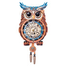 This beautifully crafted wooden clock takes the shape of an owl, combining intricate design with functional artistry. Featuring finely cut gears and Roman numerals on its dial, the clock displays a blend of vintage elegance and modern craftsmanship. The large, expressive owl eyes and vivid blue accents on the ears add a whimsical touch, making it a charming decorative piece for any room. With its pendulum and detailed carvings, this wooden owl clock not only tells time but also serves as a striking statement of nature-inspired design.