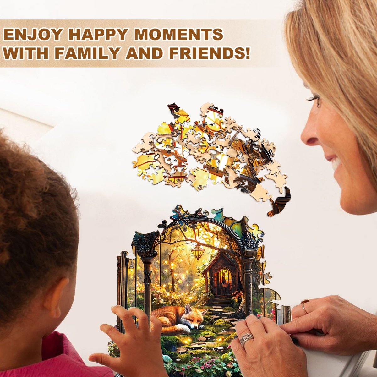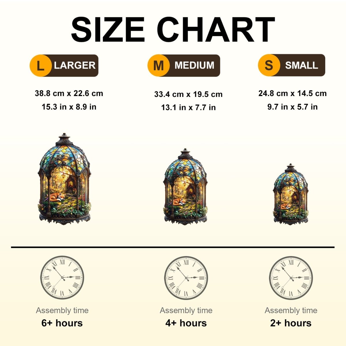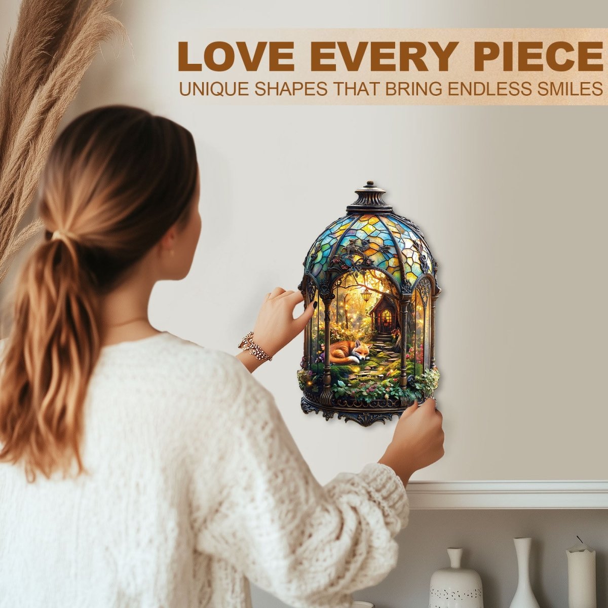 Capture a moment of forest magic with the Lantern Fox wooden puzzle. This stunning, irregularly shaped piece depicts a serene scene of a sleeping fox nestled among moss and flowers, with a tiny cottage hidden in the background, all warmly lit by twinkling lights. The entire scene is enclosed in an ornate, Tiffany-style stained glass lamp structure, giving the puzzle a vibrant, luminous quality. This high-quality wooden jigsaw is a fantasy masterpiece and a truly unique gift for those who love whimsical art and challenging builds.