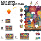 Shaped pieces are puzzle pieces handcrafted into recognisable shapes.