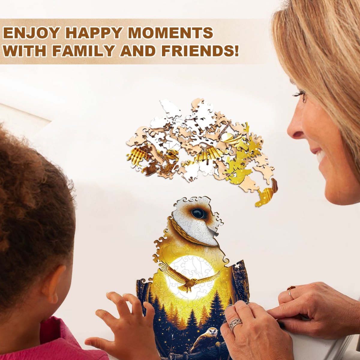 Embrace the mystery of the night with the Moonlight Snow Owl wooden puzzle. Shaped like a stunning barn owl, this unique design features an exquisite double-exposure illustration: the owl's body holds a tranquil scene of a full moon rising over a starry, pine forest, with a small owl perched on a branch. Crafted from high-quality wood, this intricately cut, challenging puzzle is a perfect gift for nature lovers and a magnificent piece of wall art once completed.