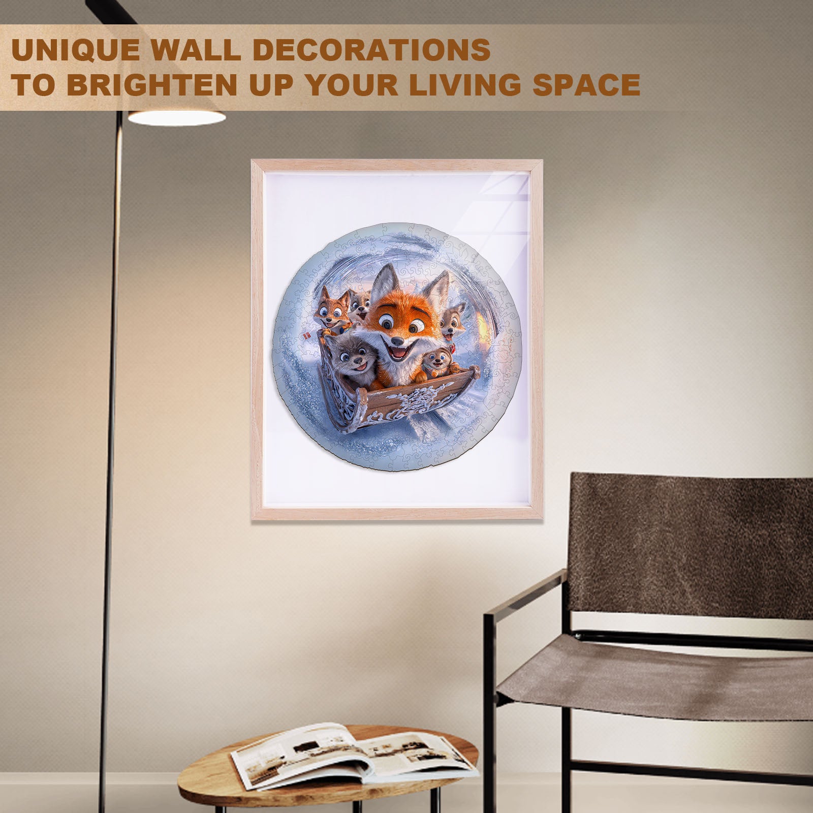 This delightful circular wooden puzzle from Kaayee captures a heartwarming winter scene. The image features a cheerful family of foxes, with the largest one at the front, all piled into a festive, decorated sleigh. Their expressions are full of joy and excitement as they speed down a snowy hill. The snowy, frosted background and the intricate details of the sleigh and the foxes’ fur make this puzzle a captivating and charming activity. Made from high-quality wood, this puzzle offers a satisfying challenge and a beautiful finished product that is perfect for celebrating the festive season.