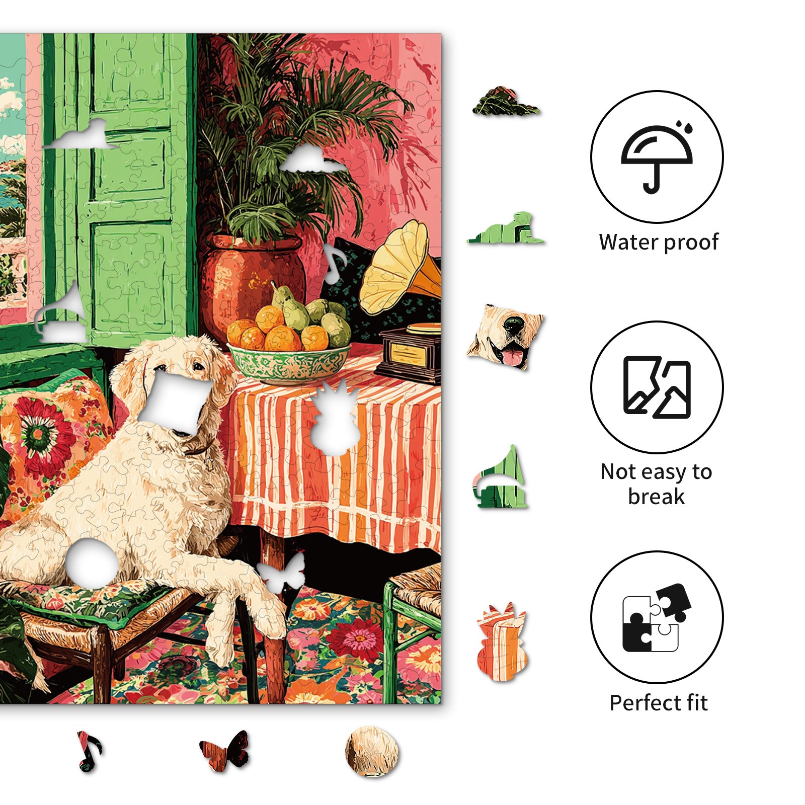 This vivid wooden jigsaw puzzle captures a bright, tropical-inspired indoor scene. A happy Golden Retriever relaxes on a chair, surrounded by bold, colorful patterns. The backdrop features a striking combination of pink walls and bright green shutters. An open window offers a glimpse of the blue sea and a distant coastline. The table beside the dog holds a bowl of fruit and a vintage gramophone, adding a touch of rustic charm to this sun-drenched corner.