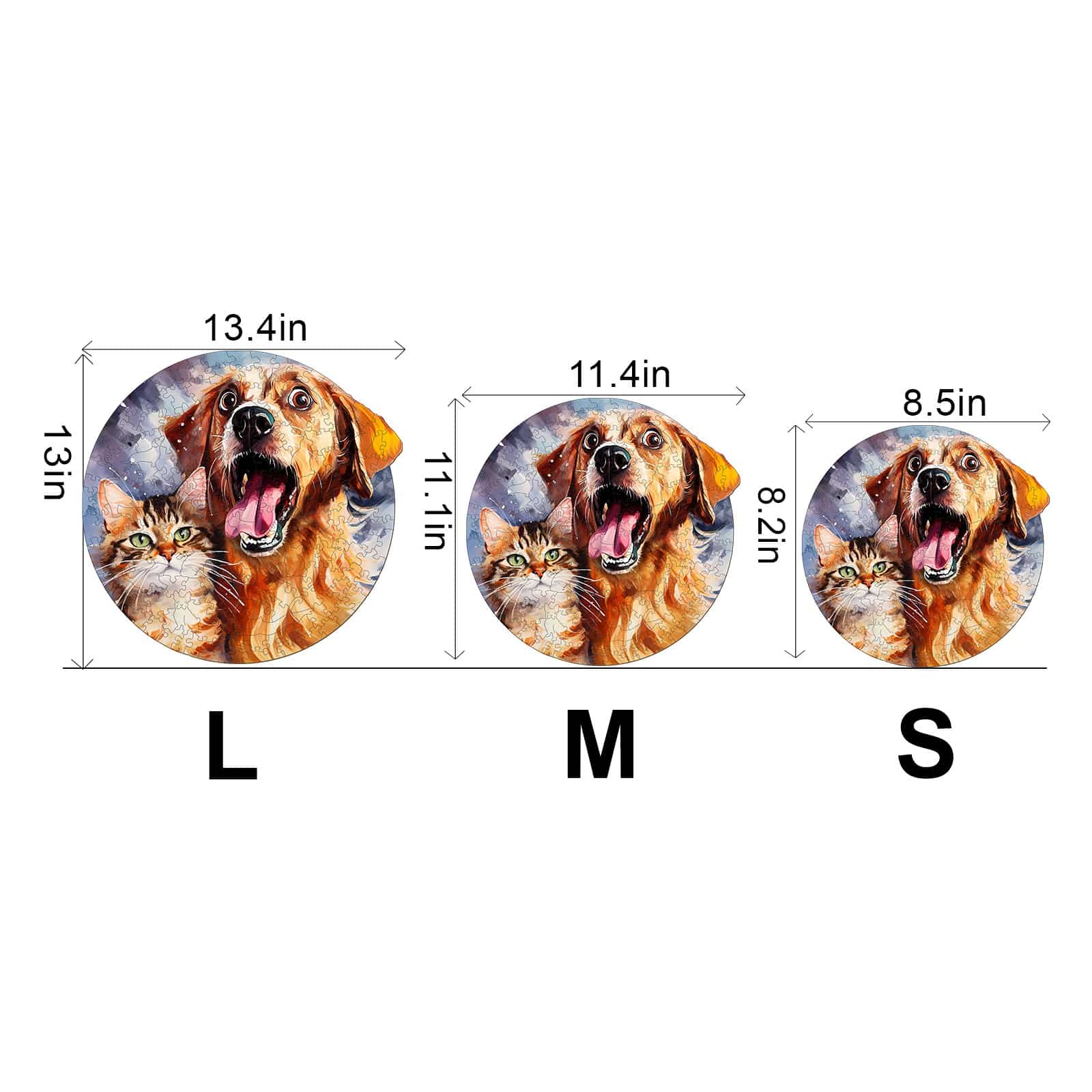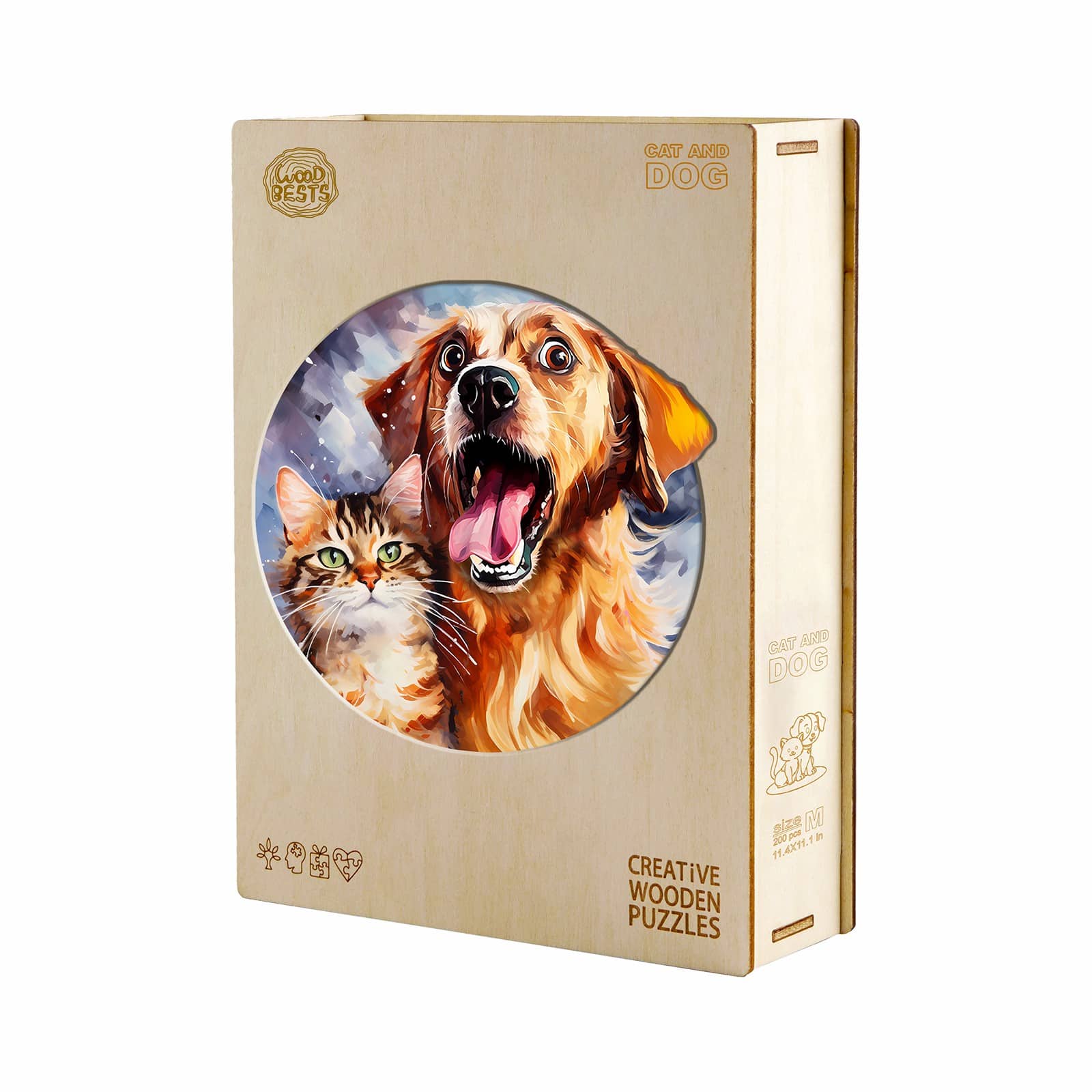 The mischievous duo, a cat and a dog, huddle together in front of the camera, sporting sly grins and playful gleams in their eyes. The cat's whiskers are twitching with excitement, while the dog's tongue hangs out cheekily. Does this moment seem like you're taking selfies with friends?