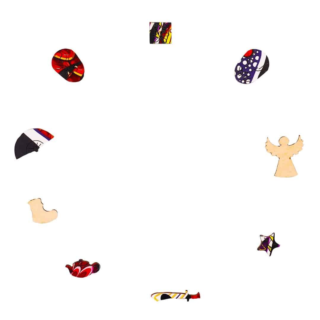 Shaped pieces are puzzle pieces handcrafted into recognisable shapes.