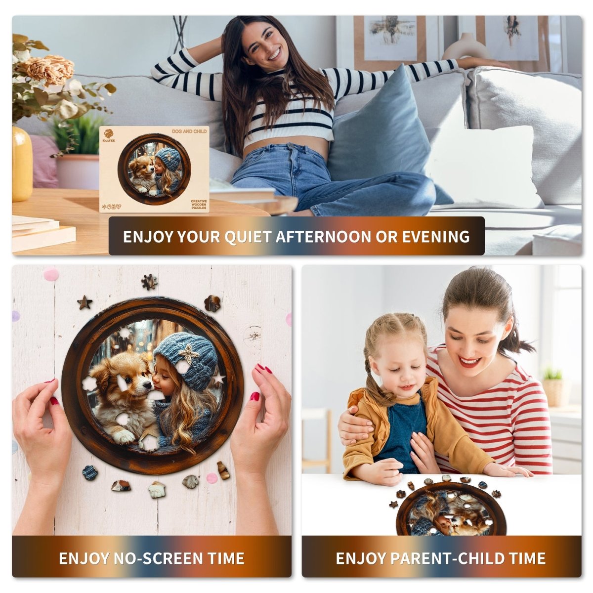 This heartwarming image, featuring a sweet child and an adorable puppy peeking through a circular wooden frame, perfectly illustrates the charming and often custom-shaped designs available from Kaayee wooden puzzles. The visible puzzle lines suggest a delightful and engaging experience for all ages.