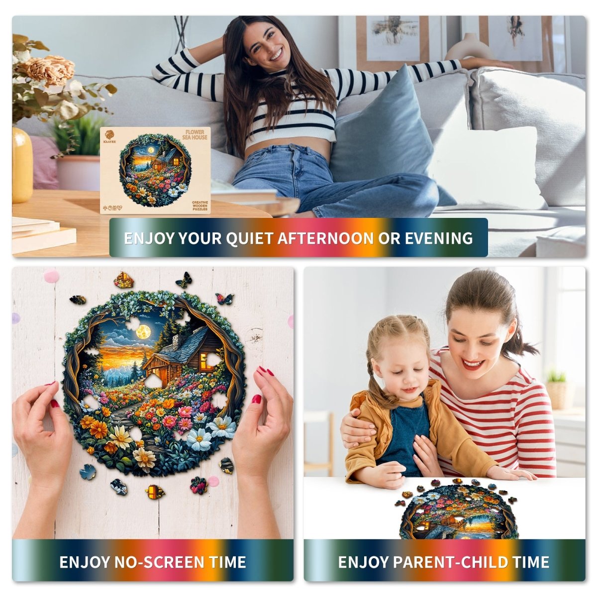 Step into a serene dreamscape with this beautifully detailed round wooden puzzle from Kaayee. Featuring a cozy cabin glowing warmly under a full moon, surrounded by a vibrant sea of wildflowers and majestic forest trees, this design captures the peace and magic of nature. Crafted with premium wood and precision-cut for a satisfying fit, this puzzle is as much a mindful escape as it is a stunning piece of art. Perfect for nature lovers and puzzle enthusiasts alike.
