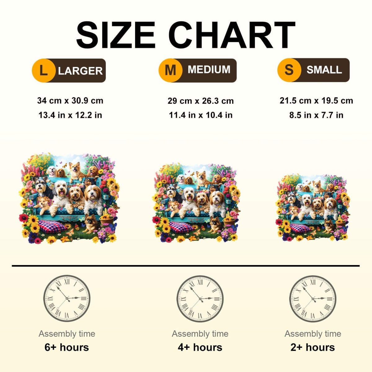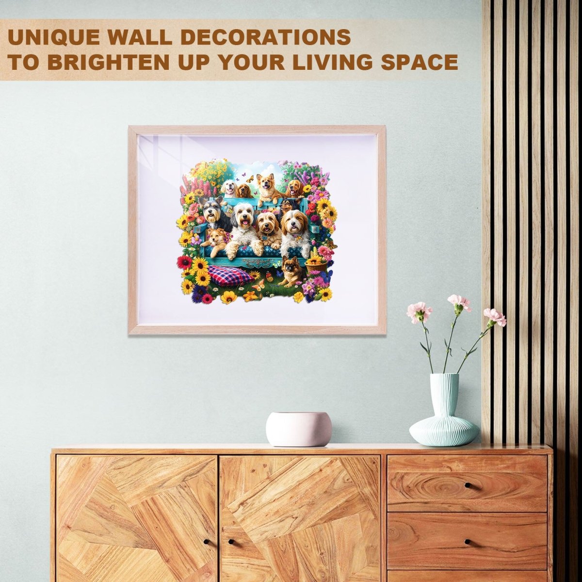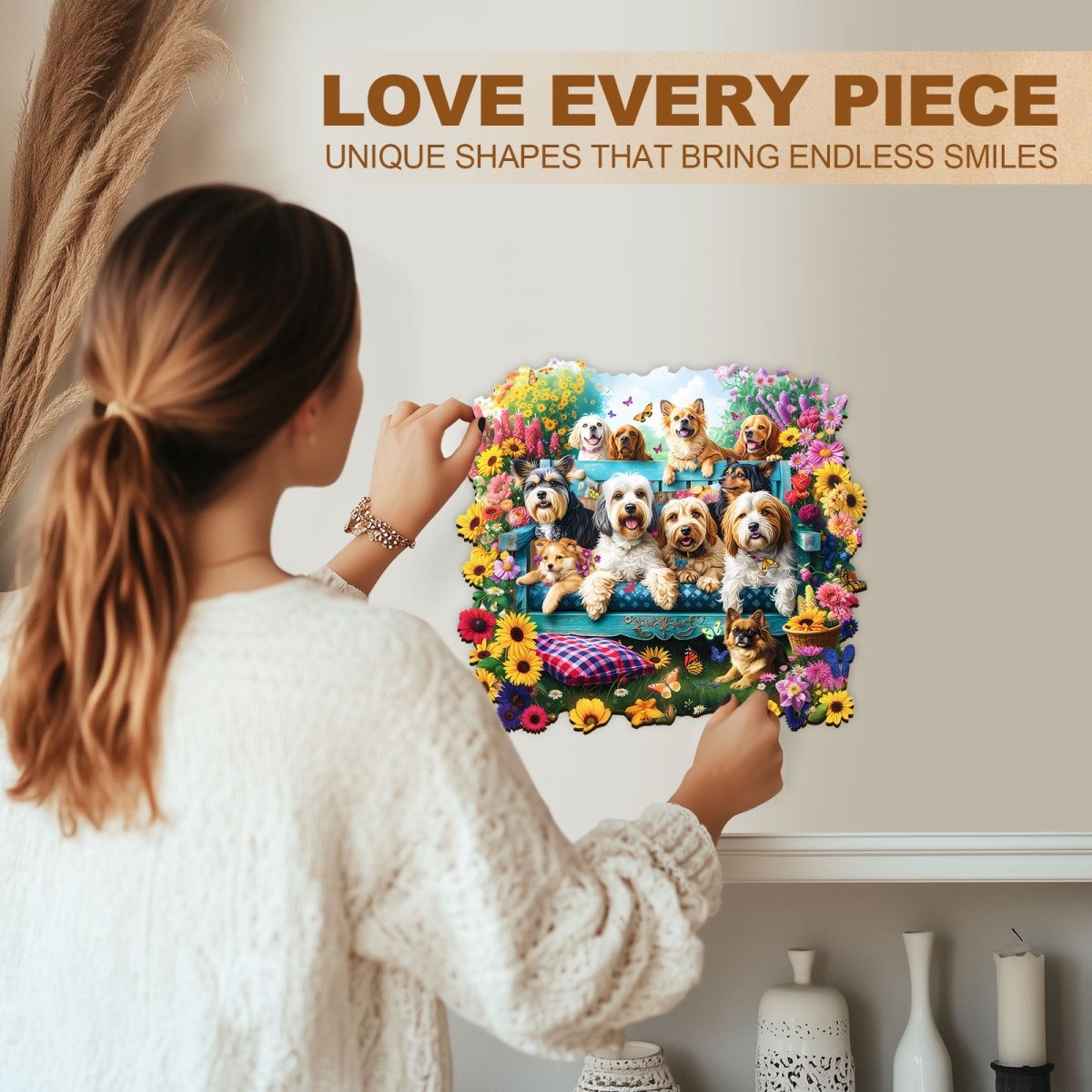 This wooden jigsaw puzzle captures a vibrant, whimsical scene brimming with adorable dogs nestled among a lavish display of summer wildflowers. Ten charming canines of various breeds are perched on and around a brightly turquoise blue bench, surrounded by brilliant sunflowers, pink and purple blossoms, and fluttering butterflies. The lush, joyful setting creates a beautiful challenge, making it a perfect, colorful puzzle for dog lovers and nature enthusiasts alike. Once completed, it forms a stunning piece of art to brighten any room.