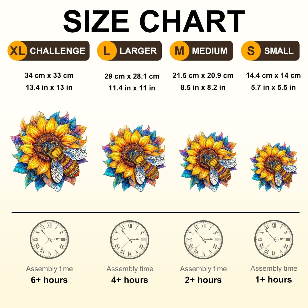 This delightful Kaayee wooden puzzle features a beautiful sunflower with a whimsical bee at its center. The puzzle’s design is a vibrant explosion of color and intricate patterns. The sunflower petals glow with shades of yellow and orange, while the leaves are rendered in striking blues and purples. The bee is a work of art in itself, with its body and wings filled with detailed, mandala-like designs. This puzzle is a perfect blend of nature’s beauty and artistic creativity, making it a great choice for those who love unique, colorful designs and a rewarding puzzling experience.