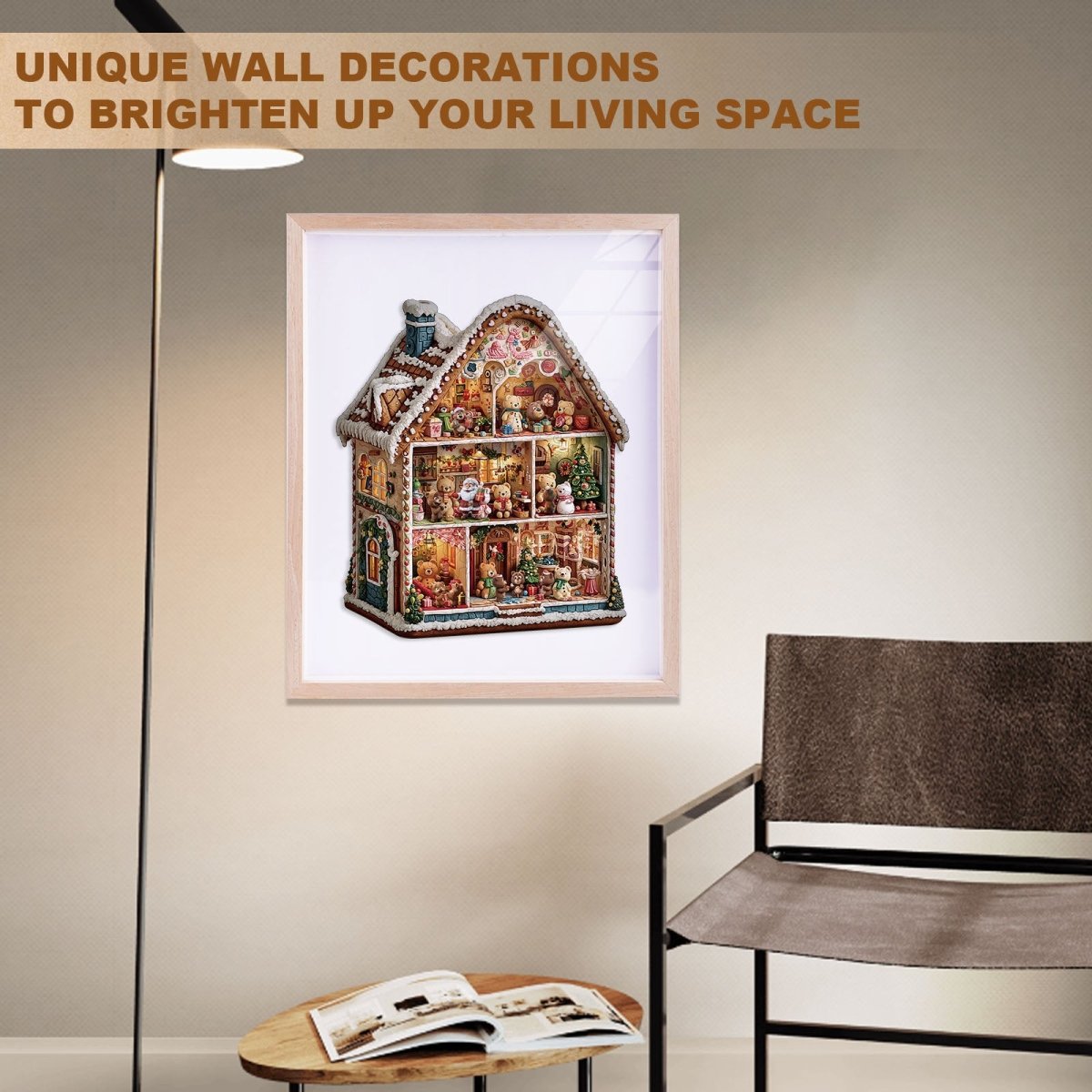 Dieses bezaubernde Kaayee-Holzpuzzle zeigt ein detailreiches und festliches „Bärenhaus“ für Weihnachten. Das Design ist einem skurrilen Lebkuchenhaus nachempfunden, dekoriert mit Zuckerguss, Süßigkeiten und Schnee. Im Inneren sind zahlreiche süße Teddybären in verschiedenen Räumen zu sehen, die die Feiertage feiern. Man sieht sie um einen Weihnachtsbaum versammelt, beim Zubereiten von Essen in der Küche und beim Entspannen in gemütlichen Ecken. Das gesamte Haus ist beleuchtet und verbreitet ein warmes und einladendes Licht. Dieses Puzzle ist die perfekte Wahl für alle, die weihnachtliche Kunst, filigrane Details und eine reizvolle, familienfreundliche Herausforderung lieben.
