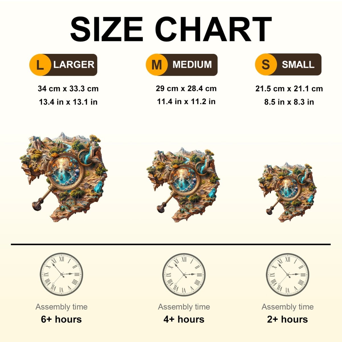 This captivating Kaayee wooden puzzle showcases a fantastical landscape where a giant magnifying glass reveals a hidden underwater world with a sailing ship and sea creatures. The intricate design features rugged cliffs, cascading waterfalls, lush greenery, and steampunk-inspired gears, blending natural beauty with mechanical wonder, offering a challenging and imaginative puzzling experience.