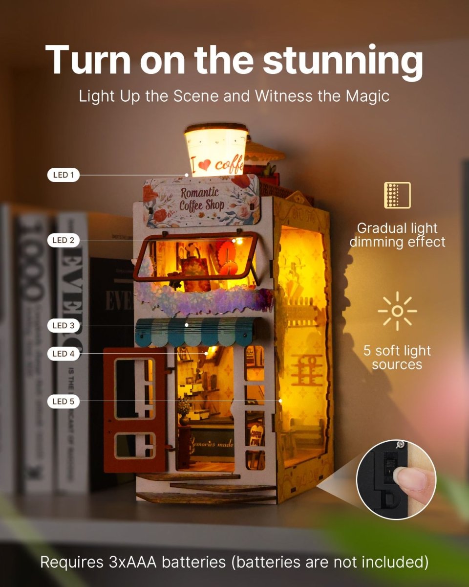 Bitte beachten Sie, dass alle Book-Nook-Kits keine Batterien enthalten. Sie benötigen möglicherweise 2 Stück AAA/LR03/AM4 1,5-V-Batterien.