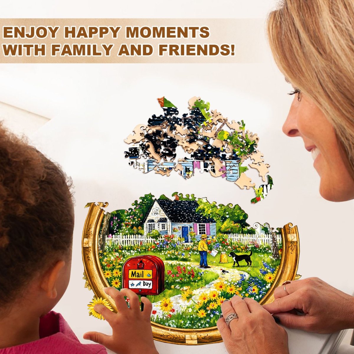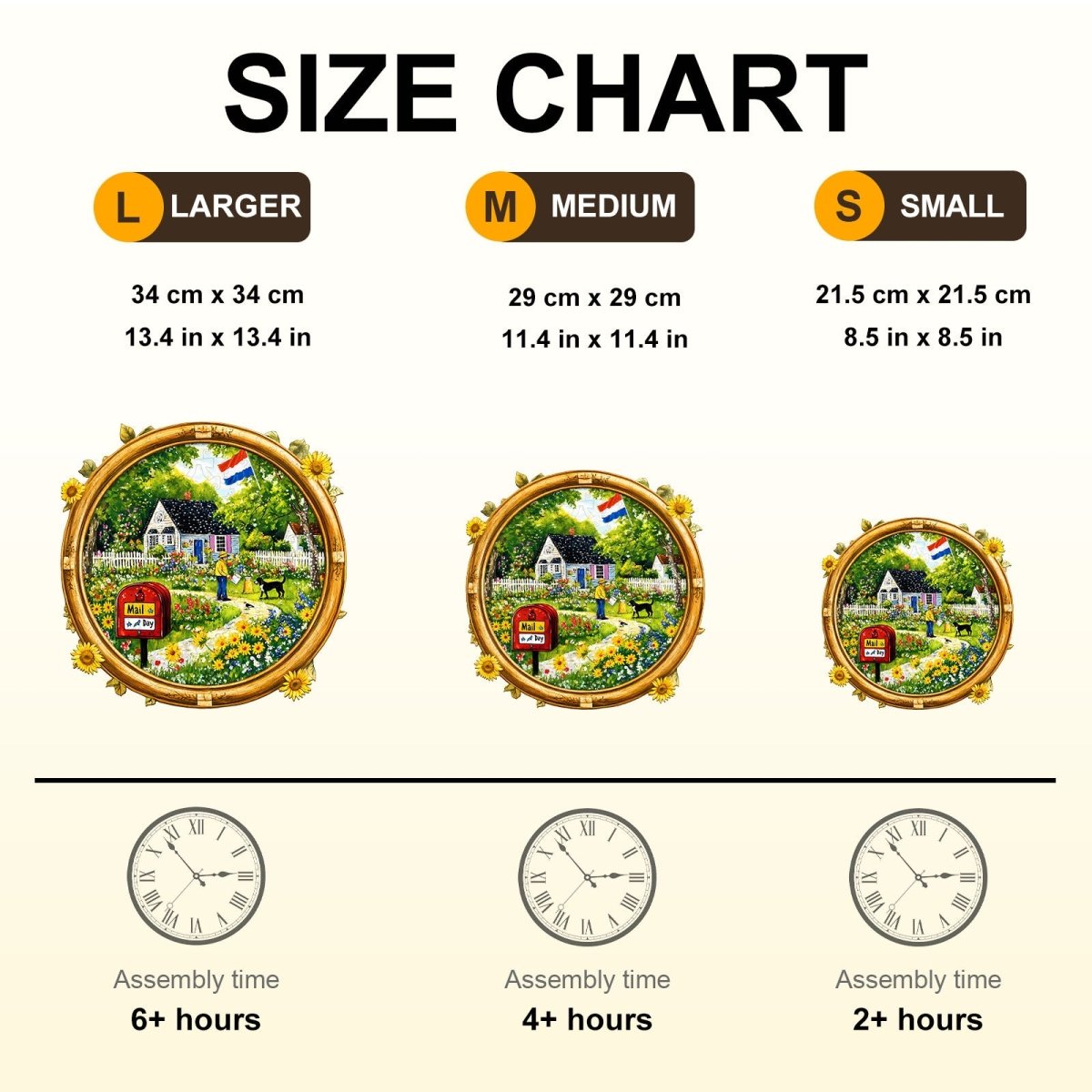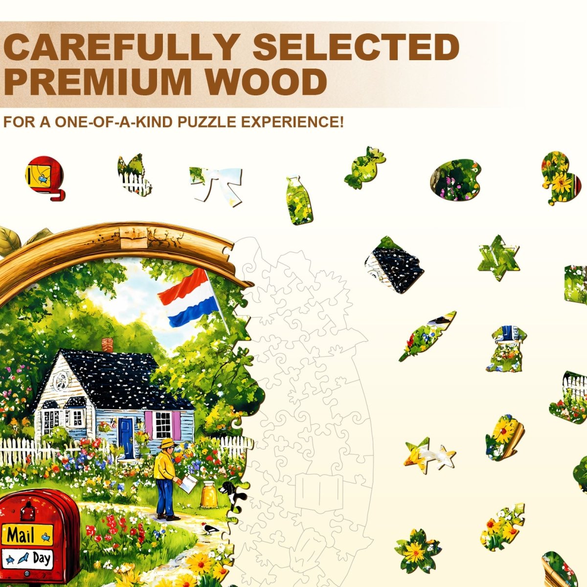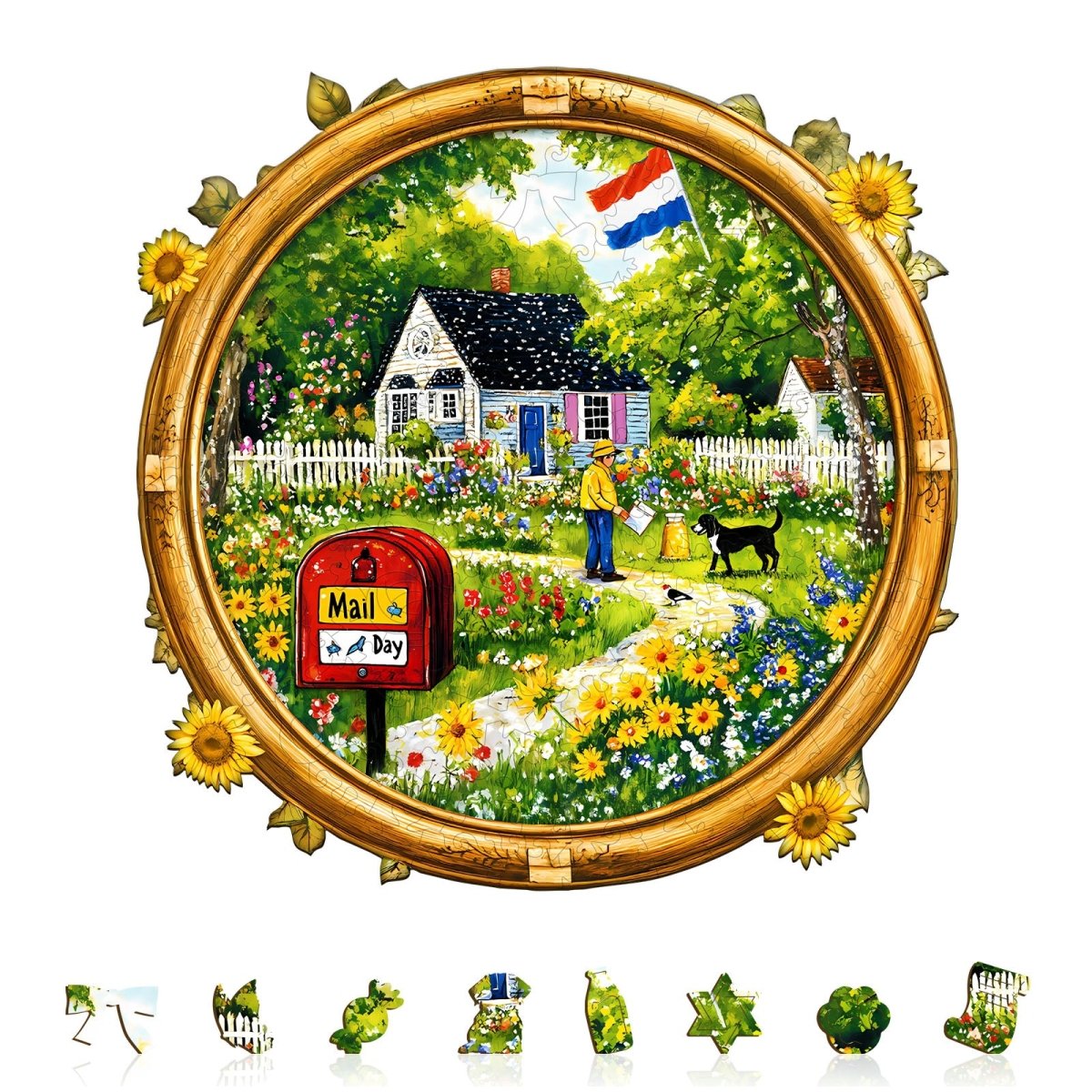 Dieses fröhliche Kaayee-Holzpuzzle zeigt eine schöne, lebendige Gartenszene, eingerahmt von einem mit Sonnenblumen verzierten Holzkreis. Das Bild fängt die Freude eines perfekten Tages ein: ein malerisches Häuschen mit weißem Lattenzaun, ein Gartenweg, der sich durch bunte Wildblumen schlängelt, und eine Person, die Post aus einem leuchtend roten Briefkasten mit der Aufschrift „Mail Day“ holt. Neben dem Weg ist außerdem ein freundlicher schwarzer Hund zu sehen, und im Hintergrund weht dezent eine niederländische Flagge. Dieses kreisförmige Puzzle mit seinen komplexen Details und der fröhlichen Atmosphäre ist eine reizvolle Herausforderung für Naturliebhaber und alle, die eine gemütliche, idyllische Szene zu schätzen wissen.