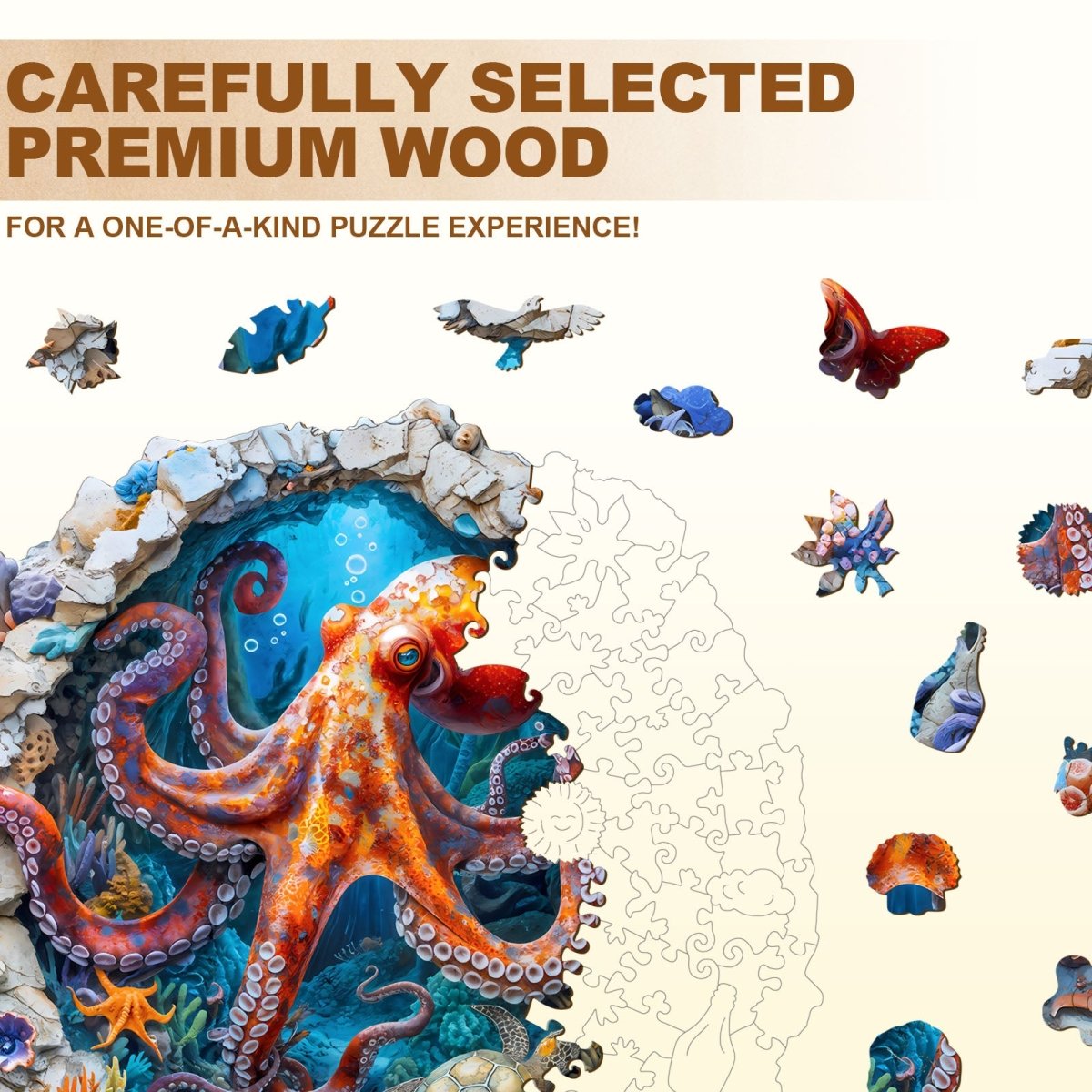 This stunning Kaayee wooden puzzle features a captivating underwater scene, showcasing a vibrant, lifelike octopus as its centerpiece. The highly detailed image depicts the majestic creature surrounded by a rich and colorful coral reef, teeming with diverse marine life. The puzzle’s unique, irregular shape adds to the challenge and aesthetic appeal, making it a beautiful piece of art once completed. Its intricate design and high-quality craftsmanship make it a perfect gift for puzzle enthusiasts and lovers of marine biology alike.