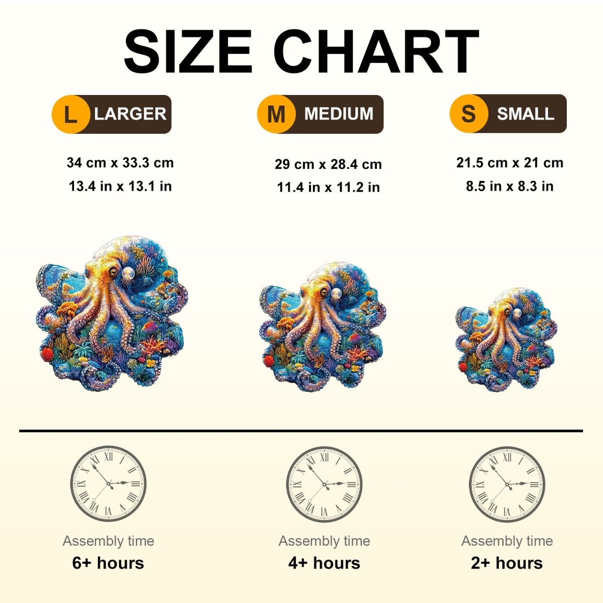 Dieses spektakuläre Kaayee-Holzpuzzle zeigt eine lebendige und detailreiche Unterwasserszene mit einem prächtigen Oktopus als Herzstück. Das Design zeigt den orange-roten Oktopus, der scheinbar aus einem üppigen Teppich aus farbenfrohen Korallenriffen, verschiedenen Seeanemonen und einem Kaleidoskop tropischer Fische auftaucht. Die filigranen Saugnäpfe des Oktopus und das wirbelnde Meeresleben sorgen für ein komplexes und fesselndes Puzzle. Die einzigartige, unregelmäßige Form des Puzzles umreißt die Gestalt des Oktopus. Dieses Puzzle ist ideal für Meeresliebhaber und alle, die atemberaubende, lebensechte Meereskunst zu schätzen wissen.