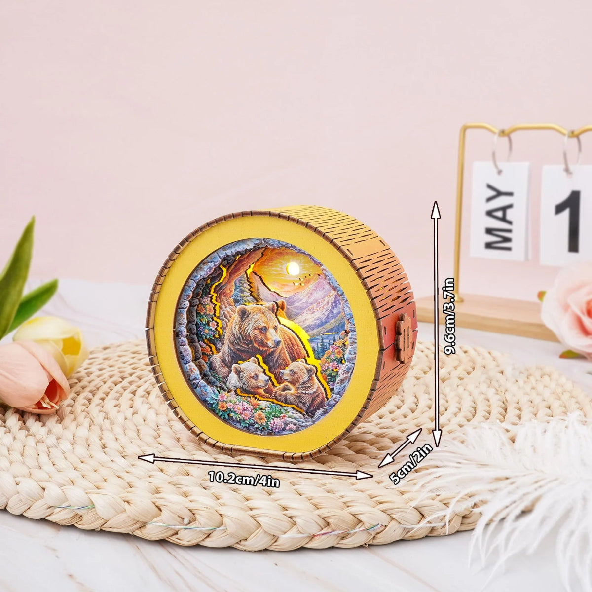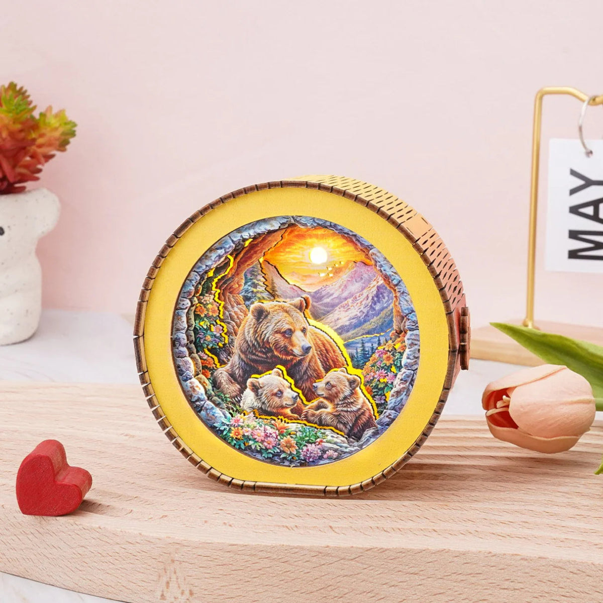 Eine sanftmütige Braunbärenmutter wacht in einem friedlichen Tal über ihre beiden niedlichen Bärenjungen. Die Szene, die an einem sonnigen Tag mit zarten Blumen am Boden spielt, erstrahlt nachts in einem wunderschönen Licht und schafft eine gemütliche, naturnahe Atmosphäre – perfekt für Schlafzimmer und alle, die Tiere und die Natur lieben.