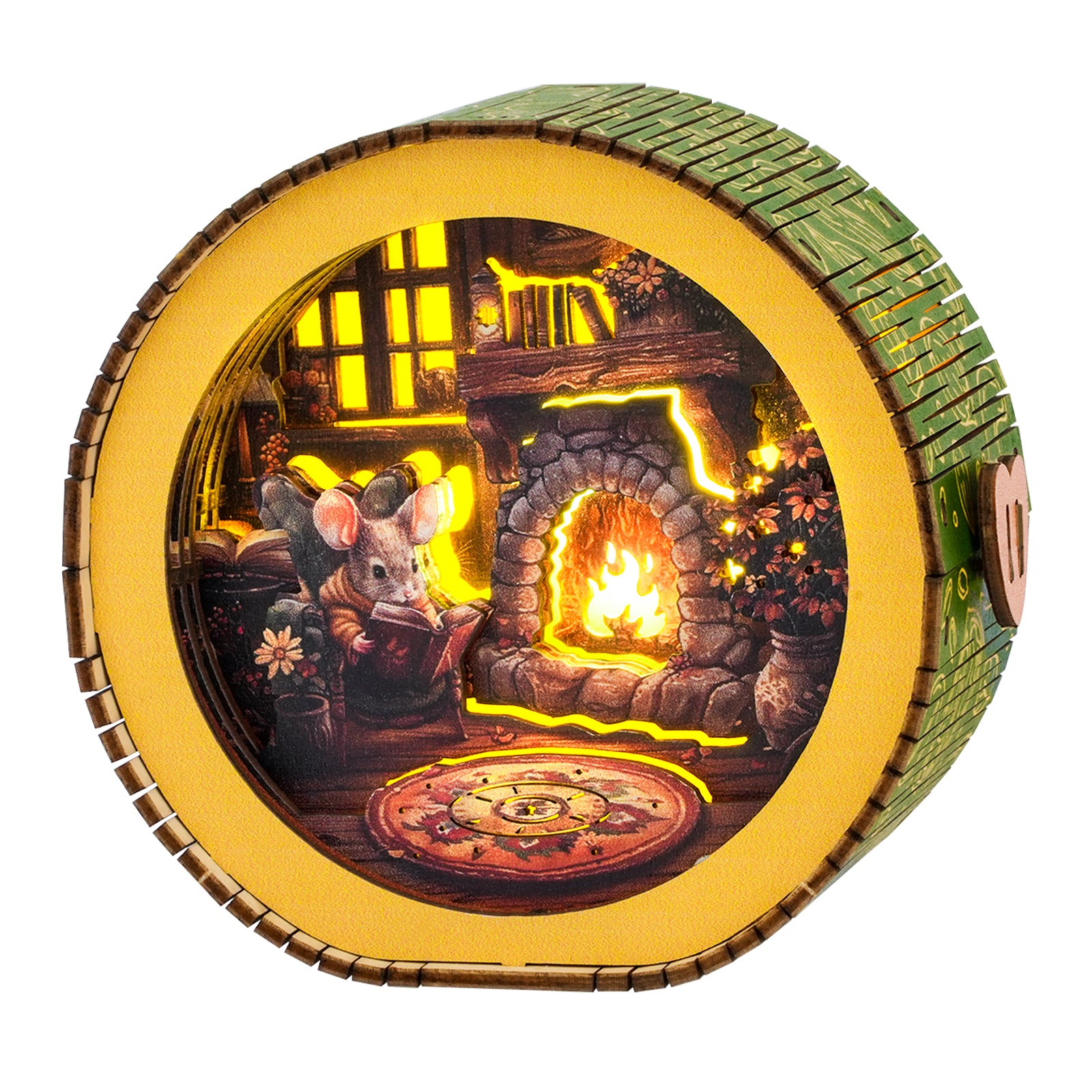 Mitten im Winter sitzt eine Ratte gemütlich auf einem Stuhl, vertieft in ein Buch, das sie gemeinsam liest. Das sanfte Feuer im Kamin erfüllt den Essbereich mit Wärme, taucht die Holzwände in goldenes Licht und lässt es über den Tisch flackern. Draußen mag der Schnee lautlos fallen, doch drinnen strahlt die Szene Behaglichkeit aus – ein warmer, inniger Moment der Zweisamkeit, des Geschichtenerzählens und stiller Freude in der kalten Jahreszeit.