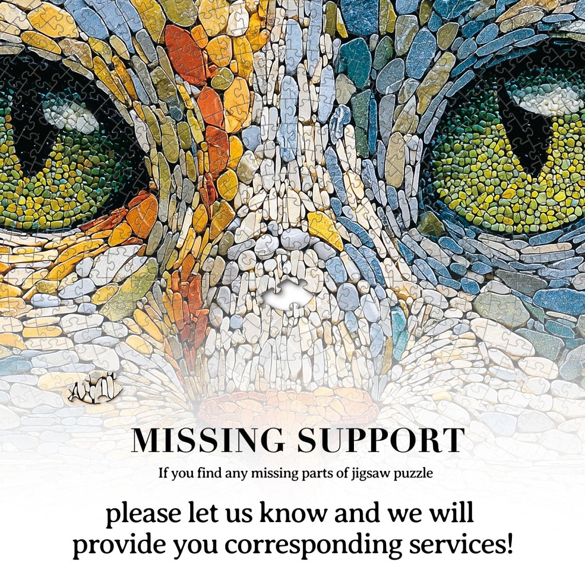 Discover the mesmerizing gaze of a feline friend with this exquisite circular jigsaw puzzle. Featuring a close-up of a calico cat's face, the image is uniquely rendered as a mosaic of smooth river stones and pebbles. The blend of cool grays, earthy oranges, and striking green eyes creates a sophisticated, tactile-inspired challenge for any cat lover or art enthusiast.