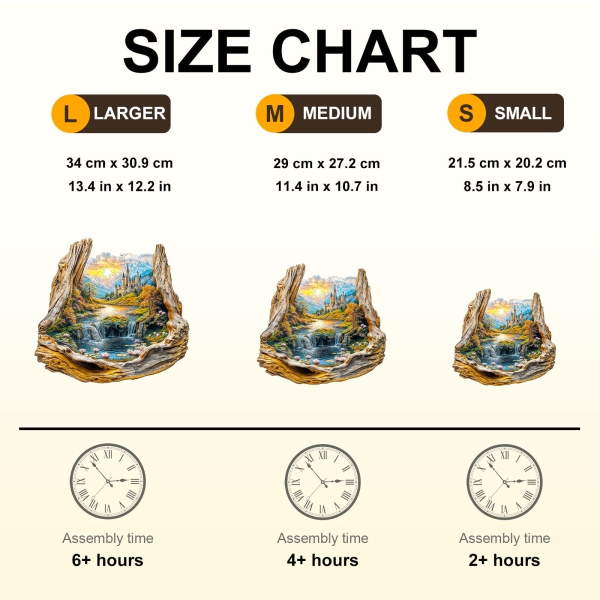 Découvrez un paysage à couper le souffle avec le puzzle en bois « Forêt Enchantée » de KAAYEE. Sa forme unique révèle une scène sereine : un majestueux château niché au cœur de collines ondulantes, que l'on aperçoit à travers le creux naturel d'un tronc noueux. L'image vibrante met en scène une cascade paisible se jetant dans un étang orné de nénuphars en fleurs, le tout baigné par la douce lumière d'un coucher de soleil. Fabriquée en tilleul écologique de haute qualité, chaque pièce découpée au laser offre un clic satisfaisant à mesure que vous assemblez ce chef-d'œuvre pittoresque. Ce puzzle est bien plus qu'un jeu : c'est un voyage au cœur d'un monde naturel et magique.