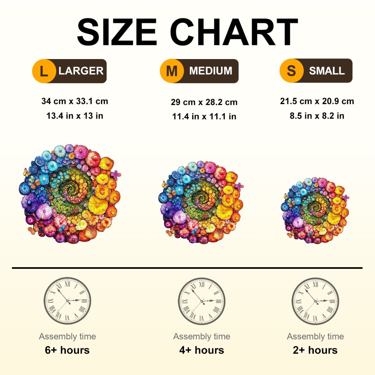Ce magnifique puzzle en bois Kaayee est une explosion de couleurs et de motifs. Ce puzzle circulaire représente une spirale hypnotisante de formes évoquant des champignons et des fleurs, agencées selon un superbe dégradé arc-en-ciel. Partant du centre avec des verts profonds et se déployant vers l'extérieur à travers des bleus, des violets, des rouges et des oranges, le motif est à la fois complexe et harmonieux. Des papillons sont subtilement intégrés à la composition florale. Ce puzzle unique et coloré est un choix idéal pour les amateurs d'art inspiré par la nature, à la recherche d'une expérience de puzzle stimulante et visuellement enrichissante.