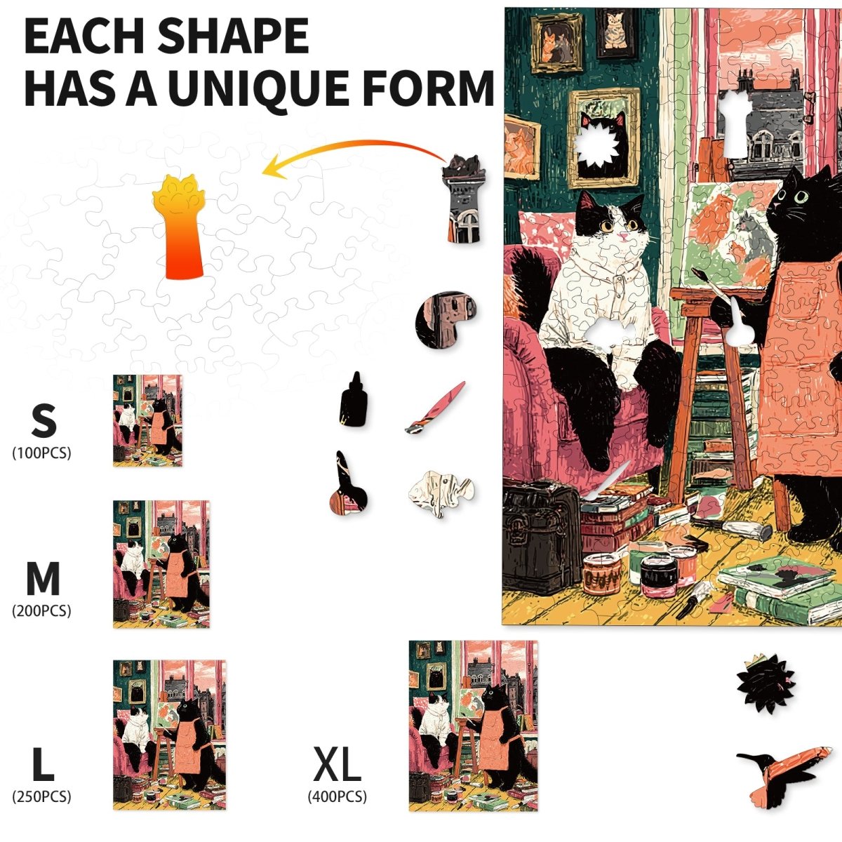 Ce puzzle artistique en bois représente l'atelier d'un peintre, un espace coloré et légèrement désordonné, peuplé de deux chats anthropomorphes. Un chat noir, vêtu d'un tablier, se tient devant un chevalet, pinceau à la main, absorbé par sa peinture. Un chat noir et blanc, également en figurine, est assis à proximité dans un fauteuil rose et l'observe. La pièce est ornée d'un mur vert foncé avec des portraits encadrés et d'une grande fenêtre donnant sur un paysage urbain européen sous un ciel aux teintes rosées. Des pots de peinture et des livres sont éparpillés sur le parquet.