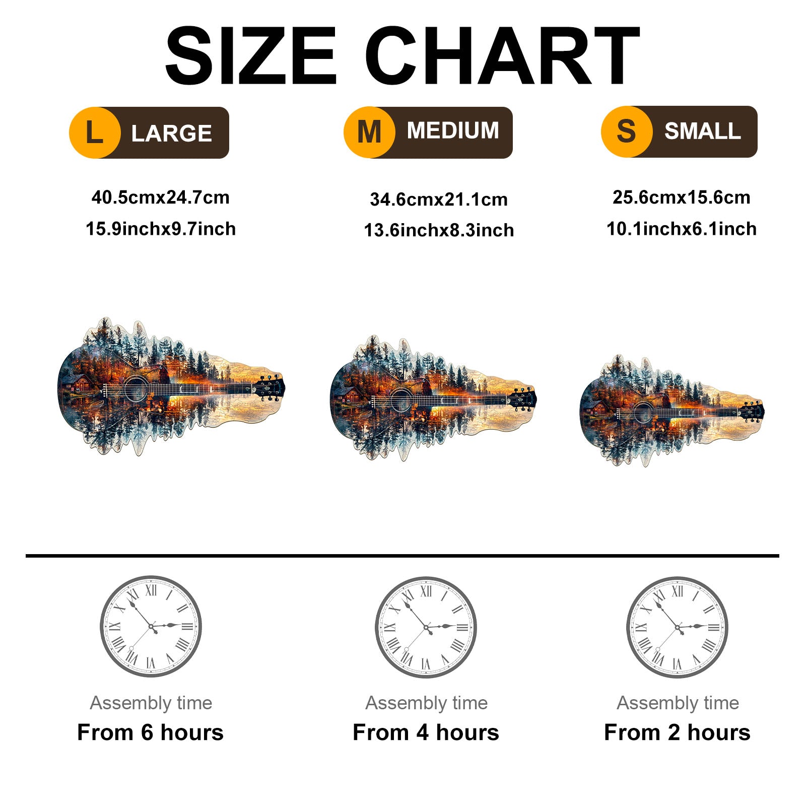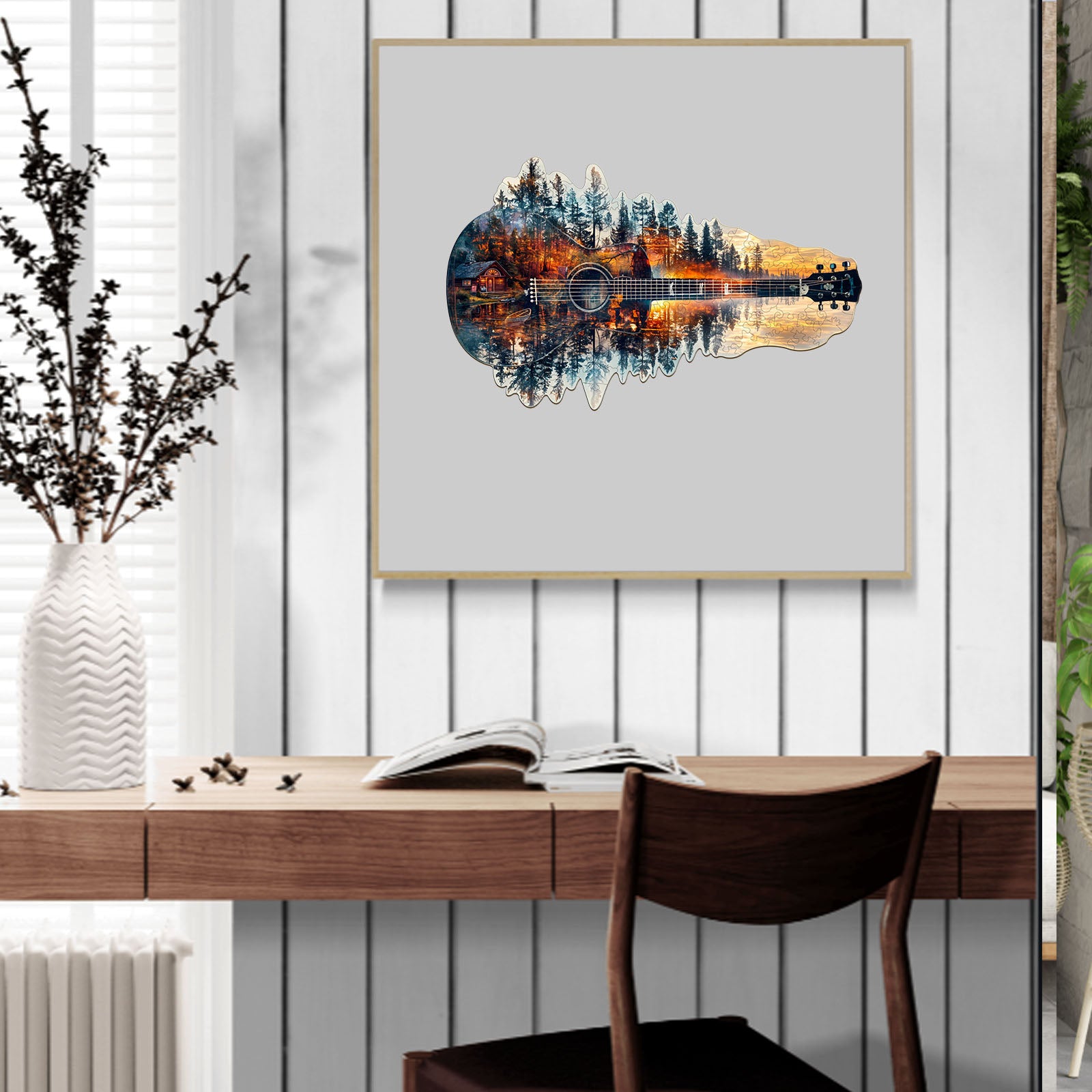 Plongez dans la beauté sereine de la nature et de la musique grâce à ce puzzle en bois unique. En forme de guitare acoustique, chaque pièce révèle un magnifique paysage forestier se reflétant sur un lac paisible au coucher du soleil. Les détails minutieux – de la cabane accueillante nichée parmi de grands pins aux douces ondulations de l'eau – font de l'assemblage de ce puzzle une expérience véritablement méditative. Idéal pour les amateurs de puzzles et de musique, ce puzzle en bois allie art, savoir-faire et une touche d'harmonie, créant une œuvre intemporelle qui pourra être exposée ou conservée précieusement longtemps après avoir été terminée.