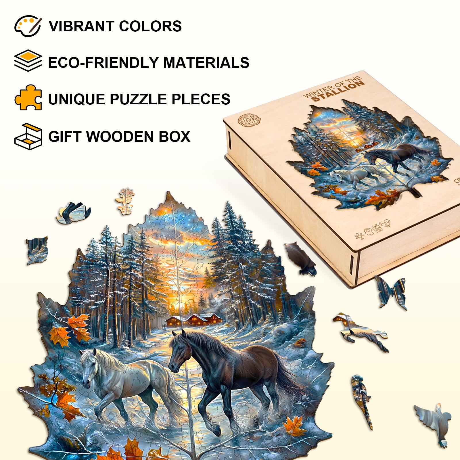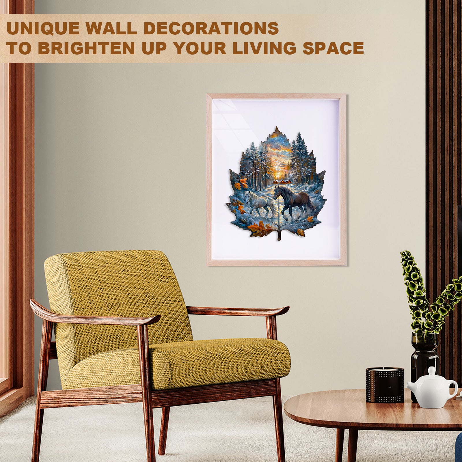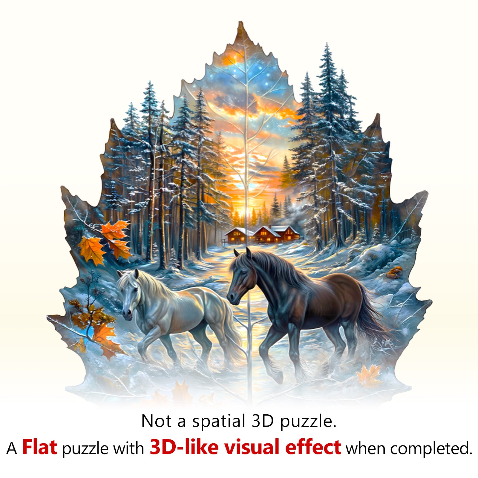 Ce puzzle en bois Kaayee unique en son genre, en forme de feuille d'érable, représente un magnifique paysage hivernal. Deux chevaux majestueux, l'un blanc et l'autre foncé, traversent un décor enneigé, avec un chalet et de grands pins en arrière-plan, le tout baigné par la douce lumière d'un coucher de soleil. La finesse des détails et la forme de la feuille font de ce puzzle une pièce vraiment exceptionnelle.