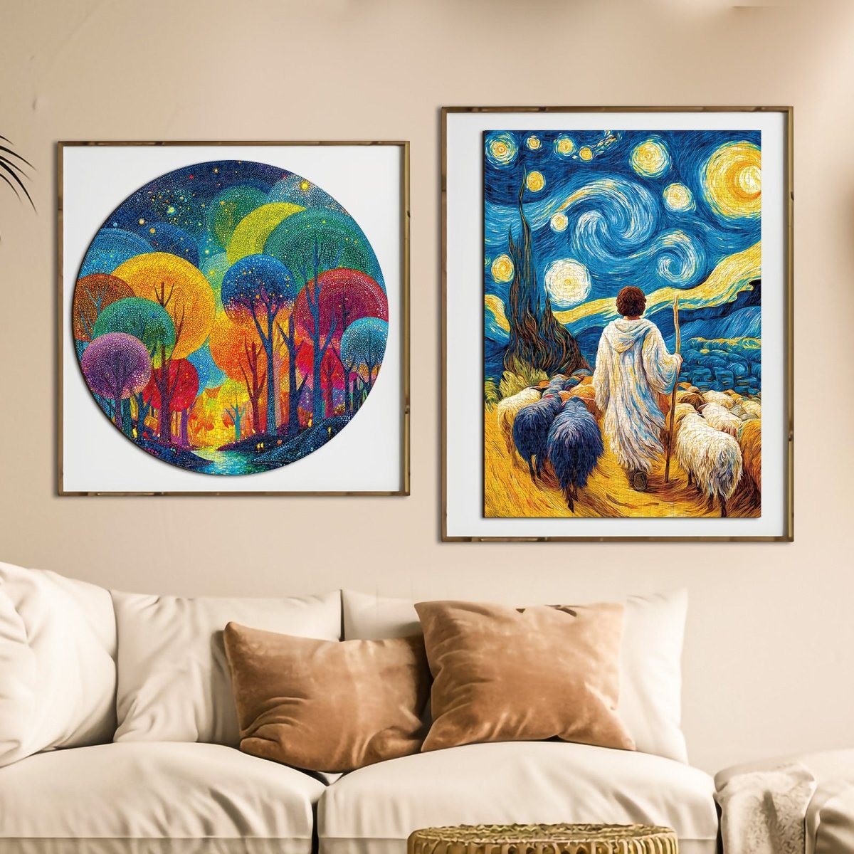 Experience a divine journey with this Van Gogh-inspired jigsaw puzzle. Depicting the Good Shepherd leading his flock under a swirling, Starry Night sky, this piece blends sacred faith with iconic post-impressionism. It is a peaceful, soul-stirring challenge that creates a masterpiece of devotion for any home.