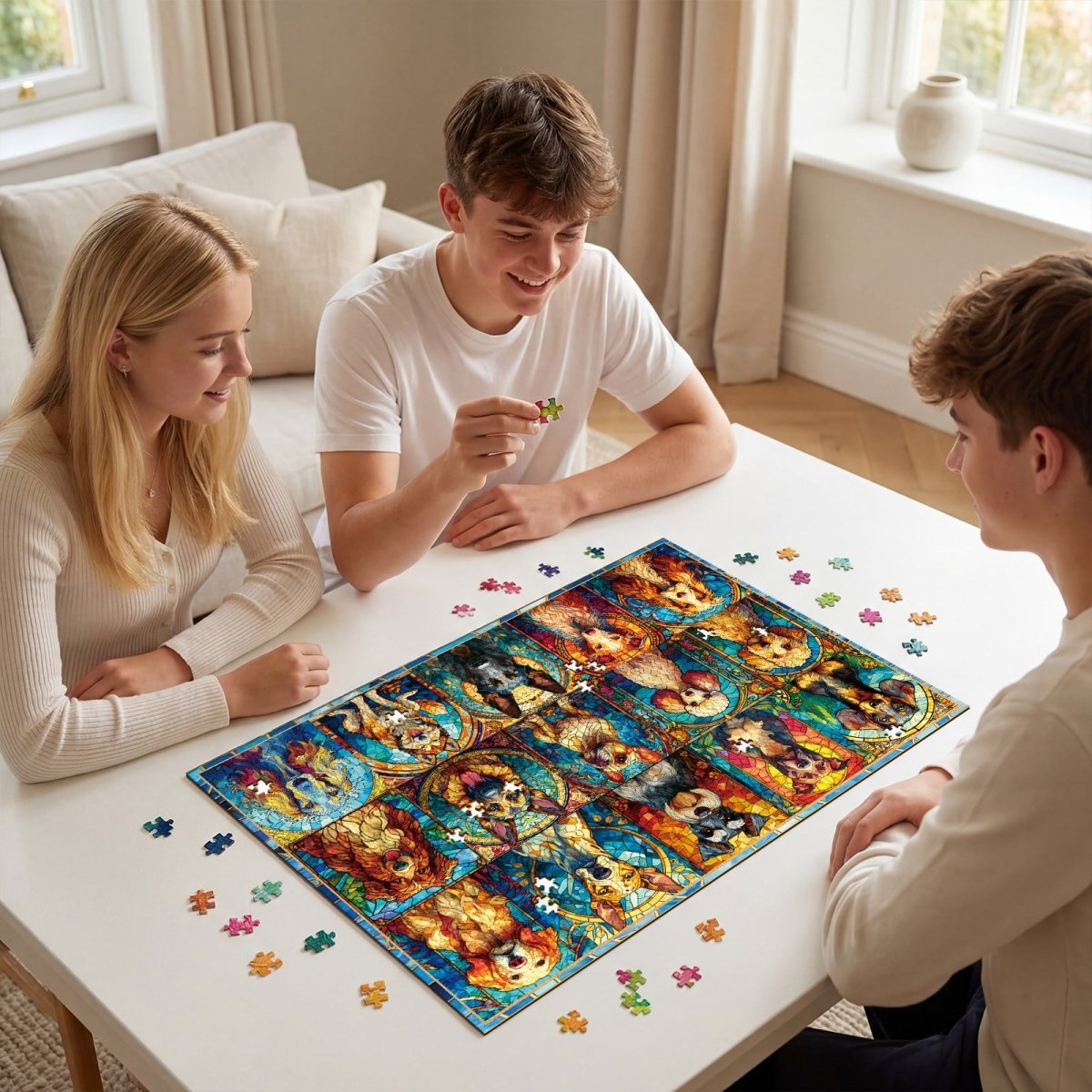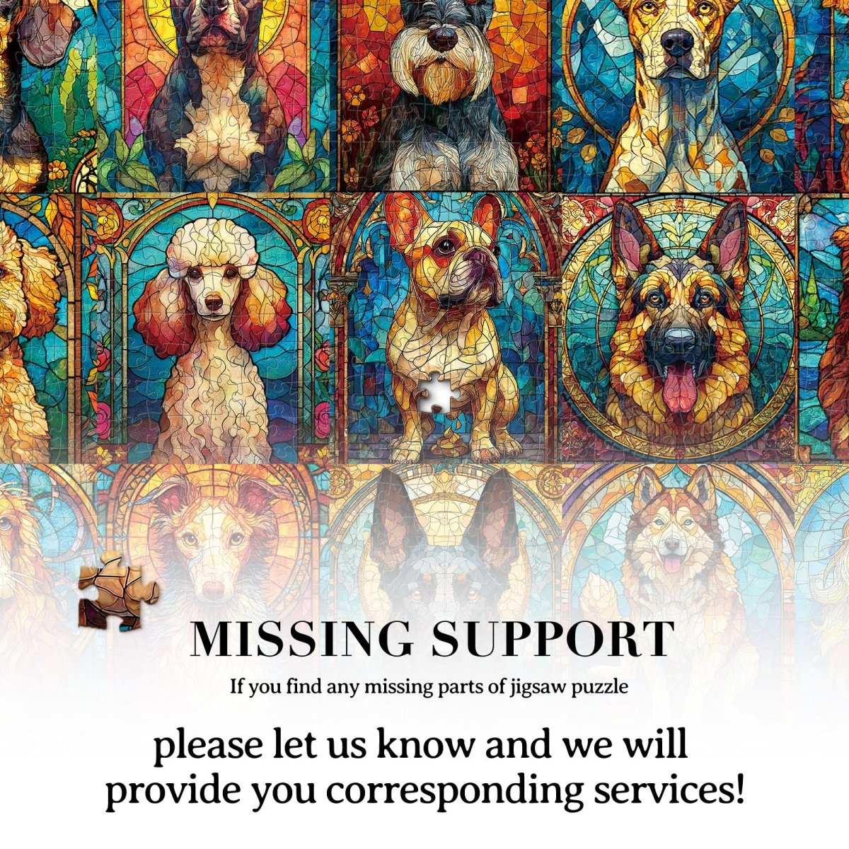 Celebrate your love for dogs with this stunning stained-glass style jigsaw puzzle. Featuring a vibrant gallery of fifteen diverse breeds, each portrait is crafted with intricate, jewel-toned patterns that mimic luminous sea glass. It is a colorful and heartwarming challenge that creates a radiant masterpiece for every pet enthusiast.