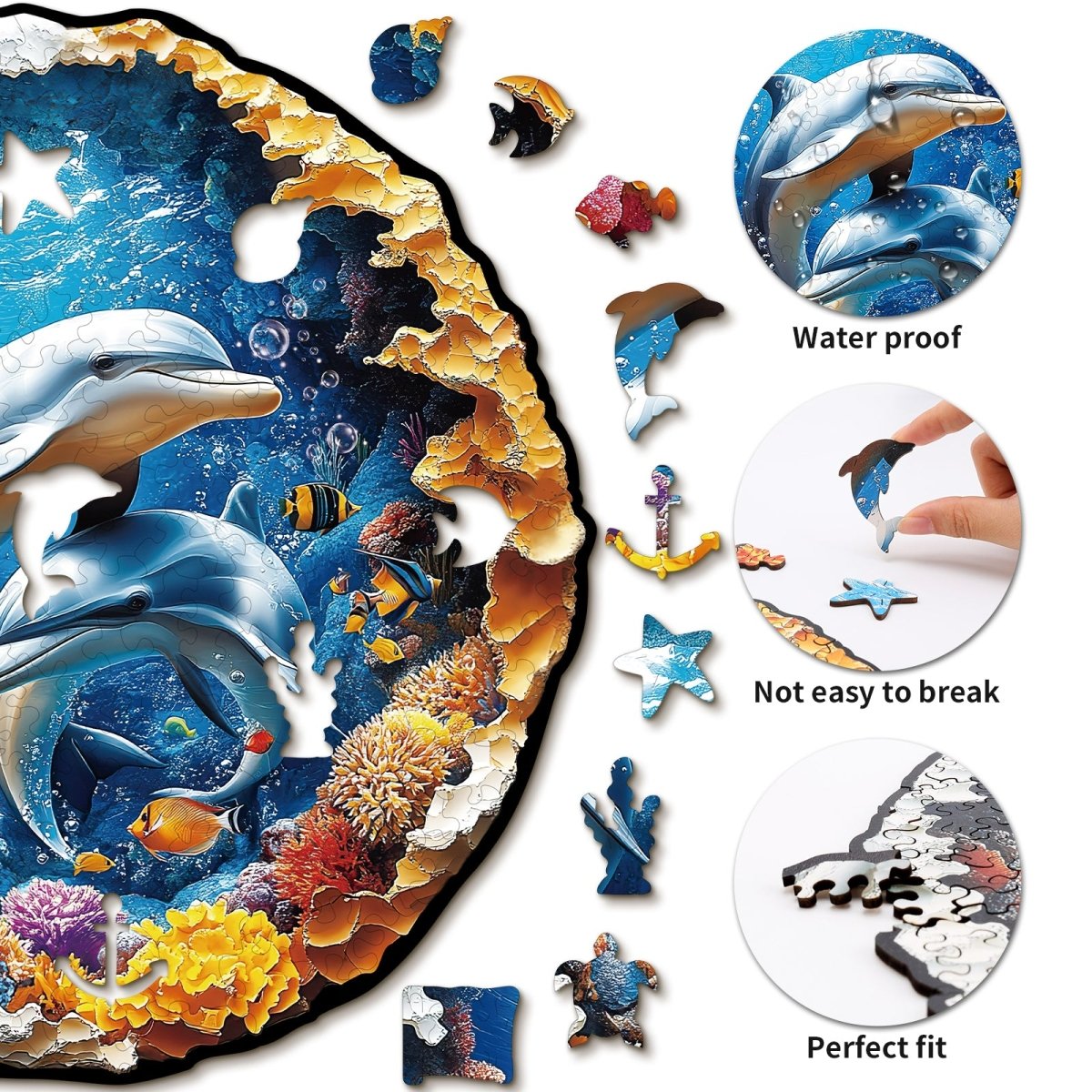 Dive into an underwater paradise with this premium wooden jigsaw puzzle. Featuring two graceful dolphins leaping through a vibrant coral reef, this circular masterpiece is teeming with colorful sea life and hidden details. Crafted with uniquely shaped pieces and high-quality wood, it’s a refreshing and mindful challenge for ocean lovers.