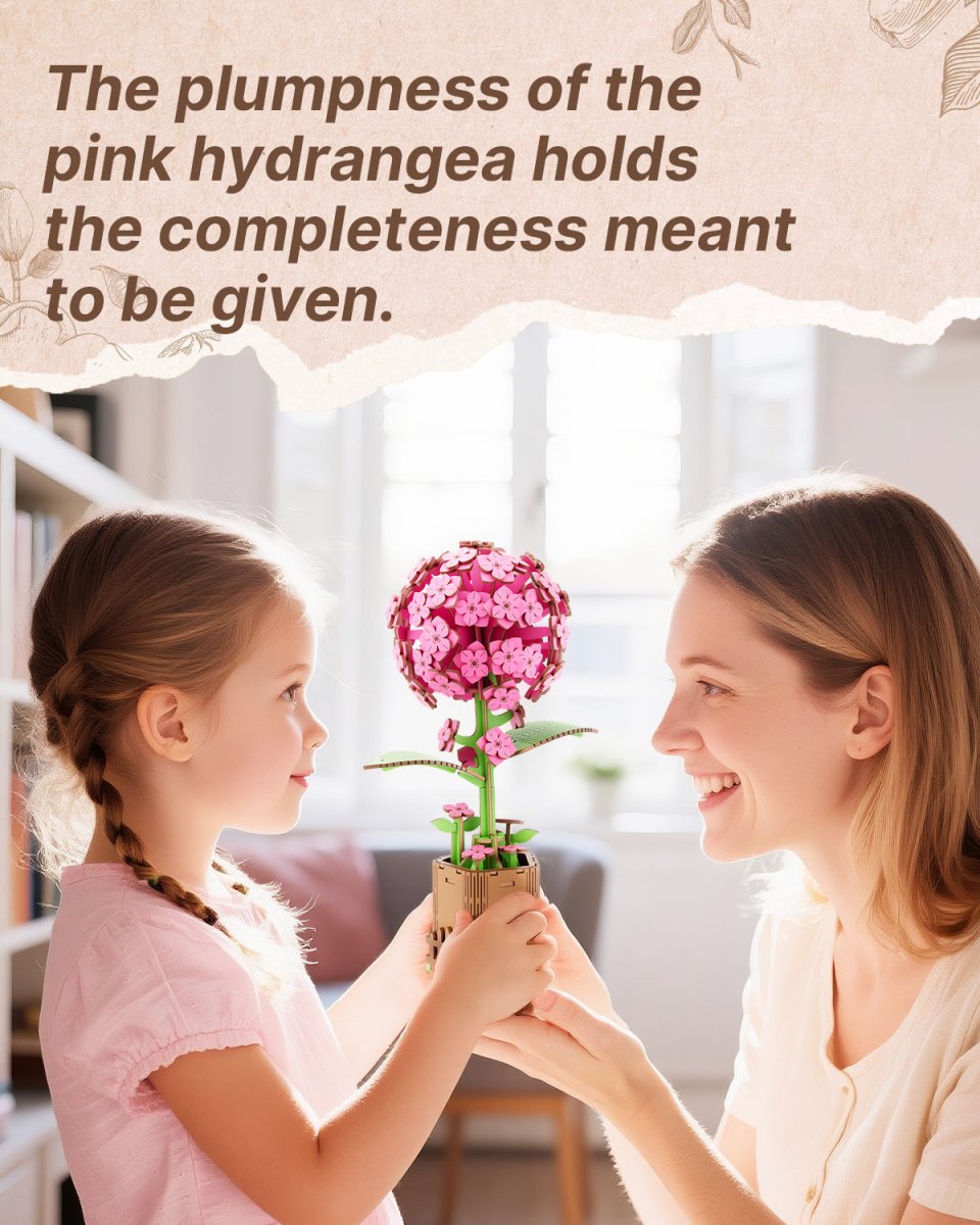 The Hydrangea DIY Wooden Flower embodies the spirit of reunion, happiness, and hope, making it a heartfelt expression of loyal love and timeless romance. Crafted with intricate wooden petals in delicate pink tones, this blooming sculpture captures the lush beauty of real hydrangeas while offering a lasting keepsake that never fades. Each piece fits together with precision, creating a joyful and relaxing building experience that symbolizes togetherness and cherished moments.