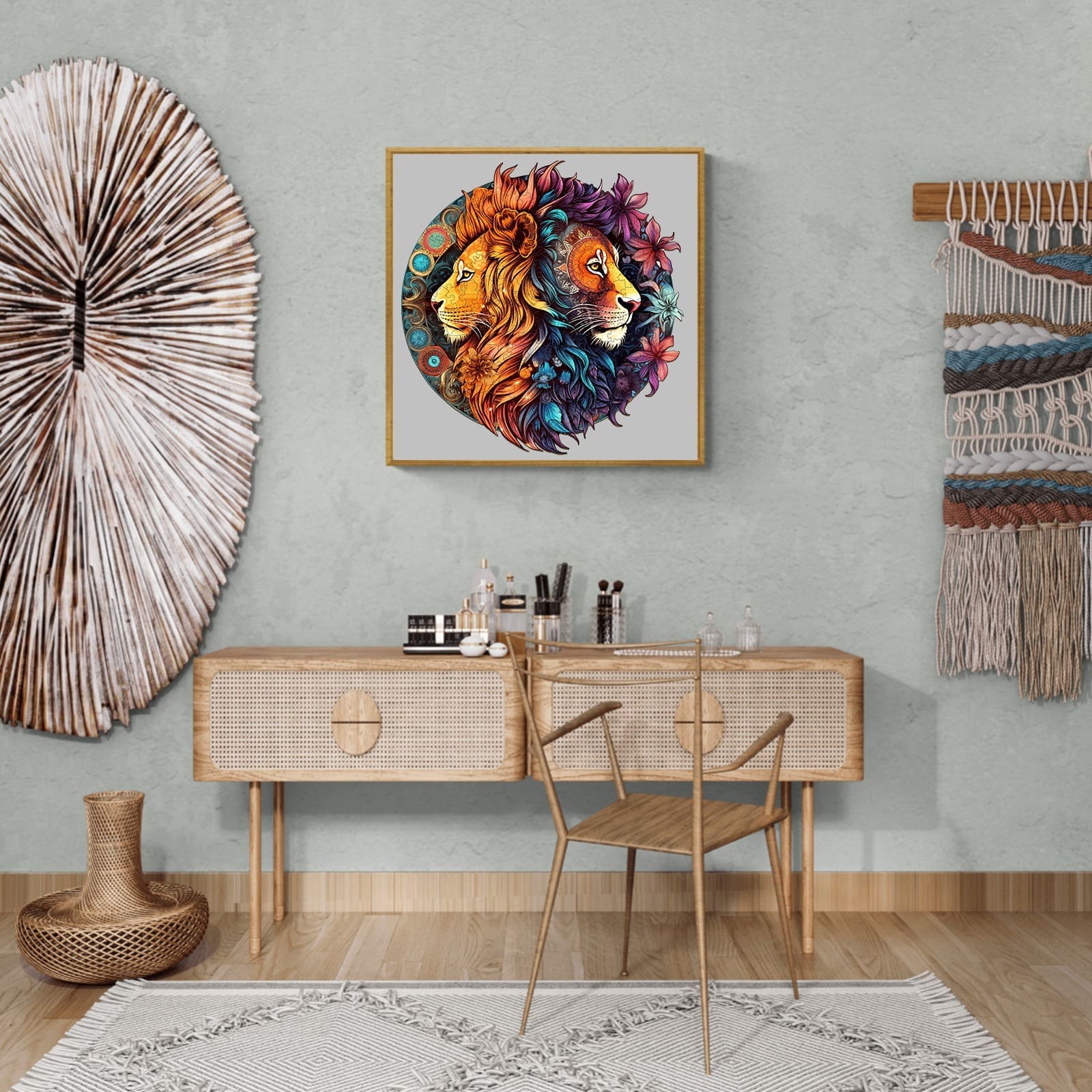 Lion, often hailed as the king of the jungle, is a powerful and majestic creature. Recognized for its distinctive golden coat and magnificent mane, the lion signifies strength and courage. As social animals, they live in pride, led by a dominant male, or lion, along with several lionesses and their cubs. These incredible felines are skilled hunters, capable of taking down large prey with their impressive speed and agility. Known for their deep roars that resonate across the savannah, lions command respect and admiration as one of nature's most iconic and awe-inspiring predators. This cool Yin-Yang Lion Puzzle features that lions on both sides have different backgrounds, like two different forces, interdependent but mutually restrictive.