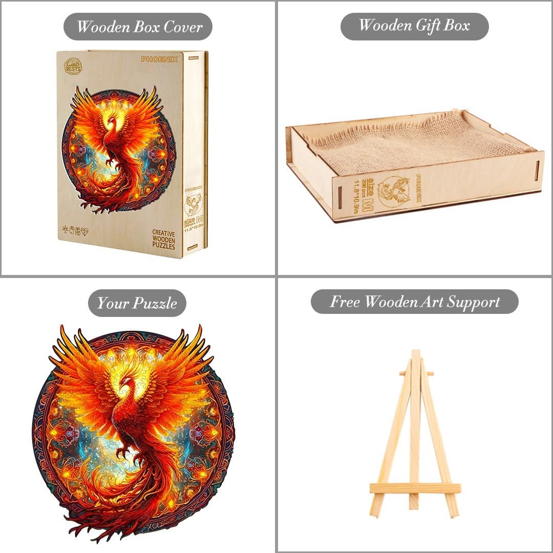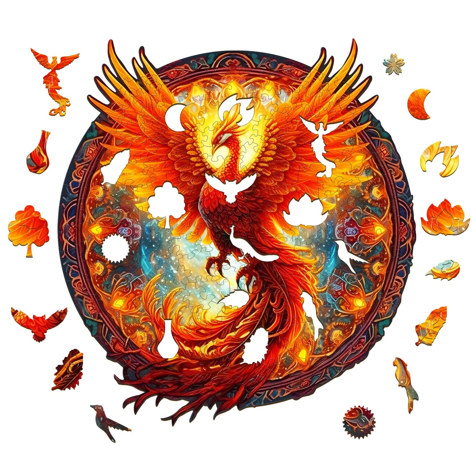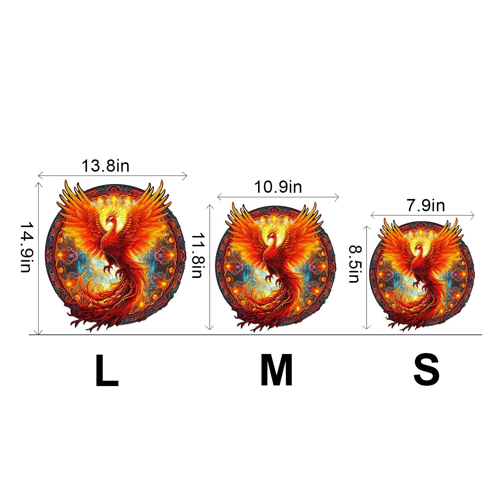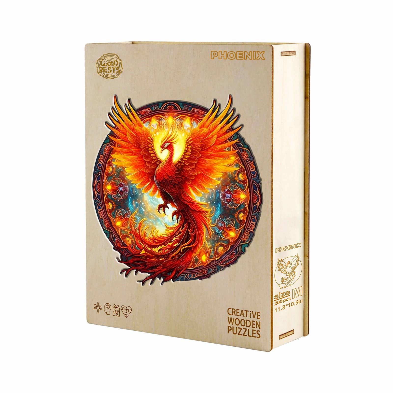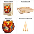 The Wooden Jigsaw Puzzle featuring the Phoenix is a meticulously crafted piece that combines artistry with challenge. This puzzle showcases a mythical phoenix, symbolizing rebirth and immortality, rendered in vibrant hues reminiscent of stained glass, adding an element of mystery and elegance to the design.